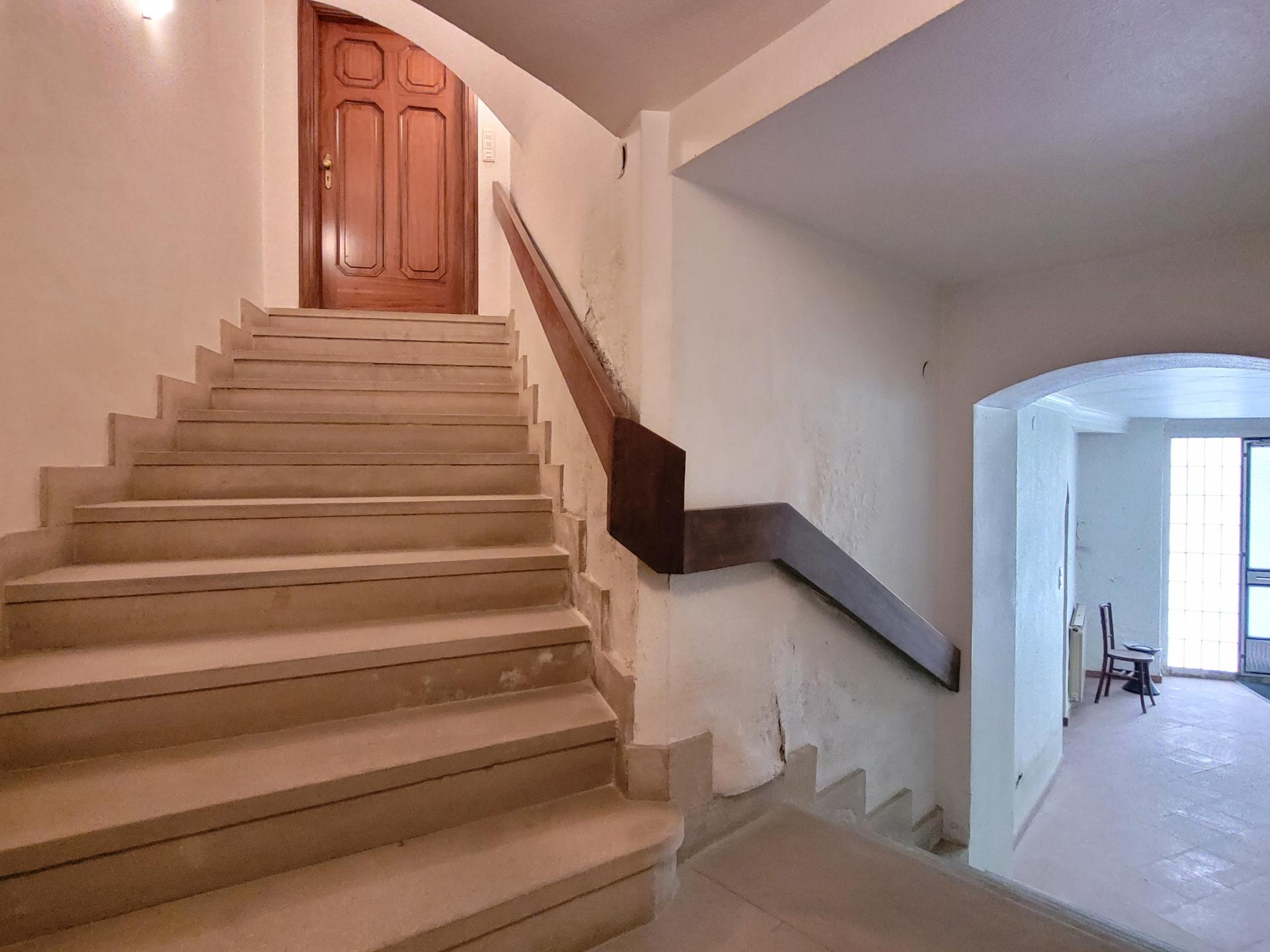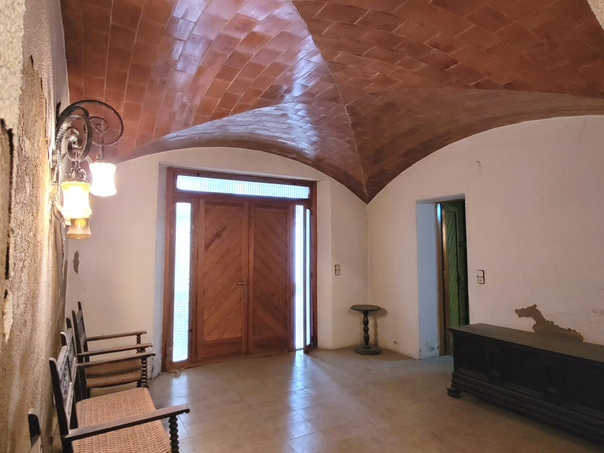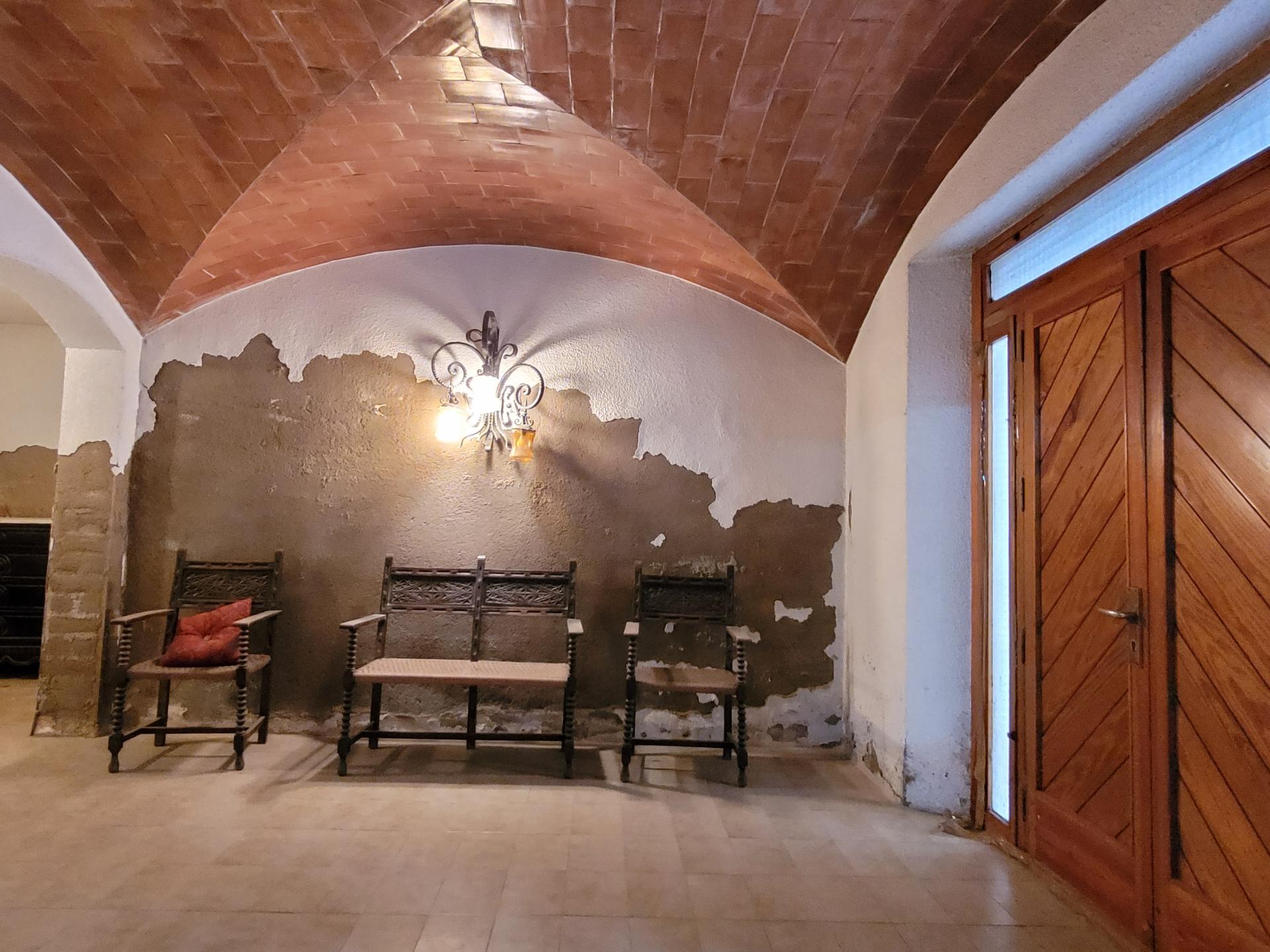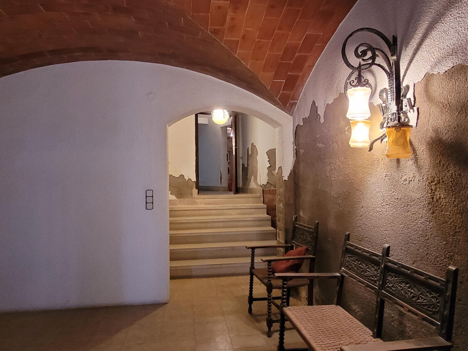 Planta baja con: Garaje amplio, sala de caldera para calefacción de gasoil, entradas por dos calles, en una un recibidor con vuelta catalana elegante y tradicional y en la otra con un gran hall, ideal como espacio de bienvenida donde también hay un despacho, aseo y una sala polivalente. Acceso a la primera planta por una impresionante escalera de piedra.